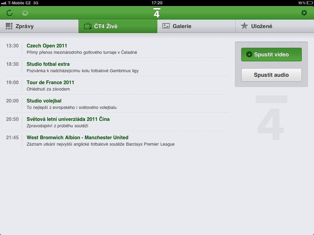Sportovní Čtyřka má už aplikaci na iPhonech, chytrých Nokiích i v operačních systémech Google Android a Samsung Bada. Aplikace pro iPady je tak pro ČT4 pátou platformou, kde tento program živě vysílá.